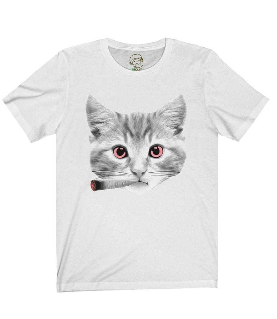 Solid white tshirt of a cat smoking a blunt. This funny 420 cat shirt makes a great party shirt, festival shirt, or gift for your stoner friends. What's better than weed an kitties!?