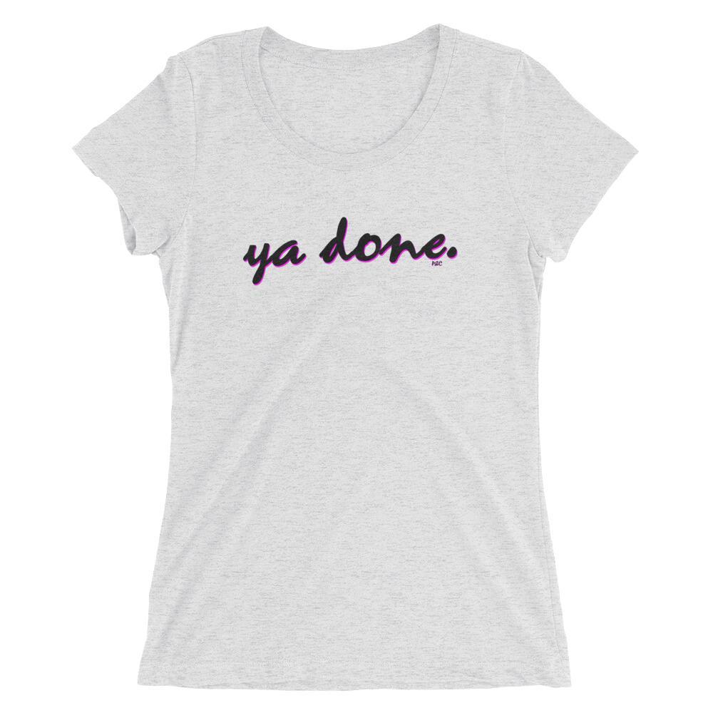 "Ya Done" women's shirt. Inspired by comedian Michelle Wolf. A super-soft, form-fitting, breathable t-shirt with a slightly lower neckline than a classic t-shirt. Classy & sassy, by Polly & Crackers.