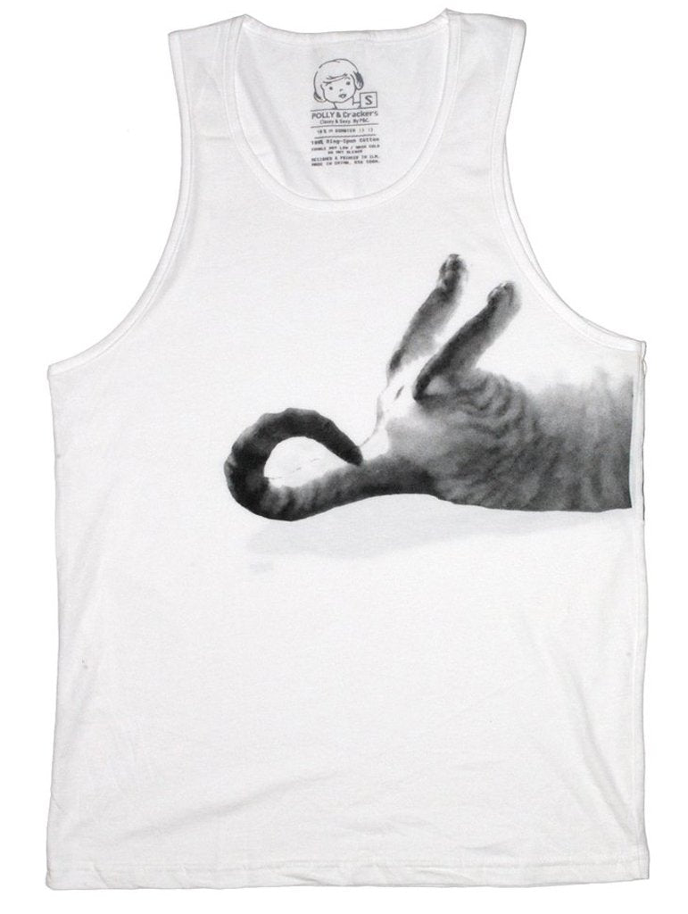 Everyone see this shirt/tank  with various meaning. A cat doing yoga, a cat pleasuring itself, or a cat taking a giant shit. In reality, it's my neighbor's cat cleaning itself and giving the audience judgmental, bedroom eyes. Here's a pic of our candid cat model, Sebastian, showing us his a-hole.