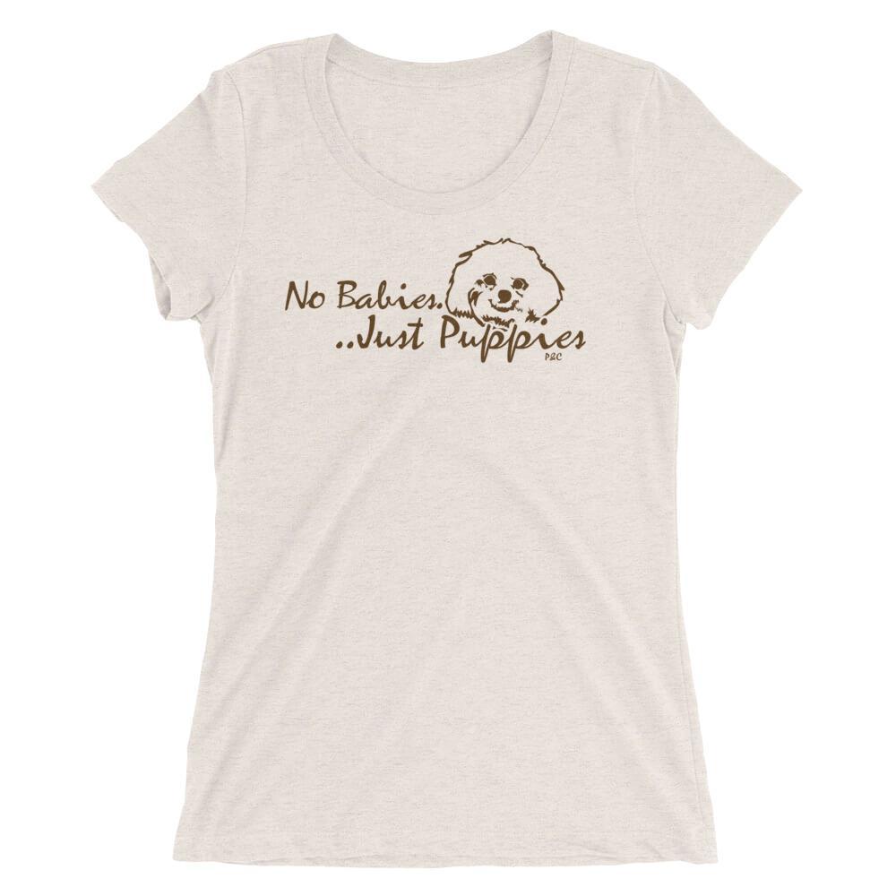 "No Babies, Just Puppies" women's shirt. A super-soft, form-fitting, breathable t-shirt with a slightly lower neckline than a classic t-shirt. Makes a great dog lovers gift!